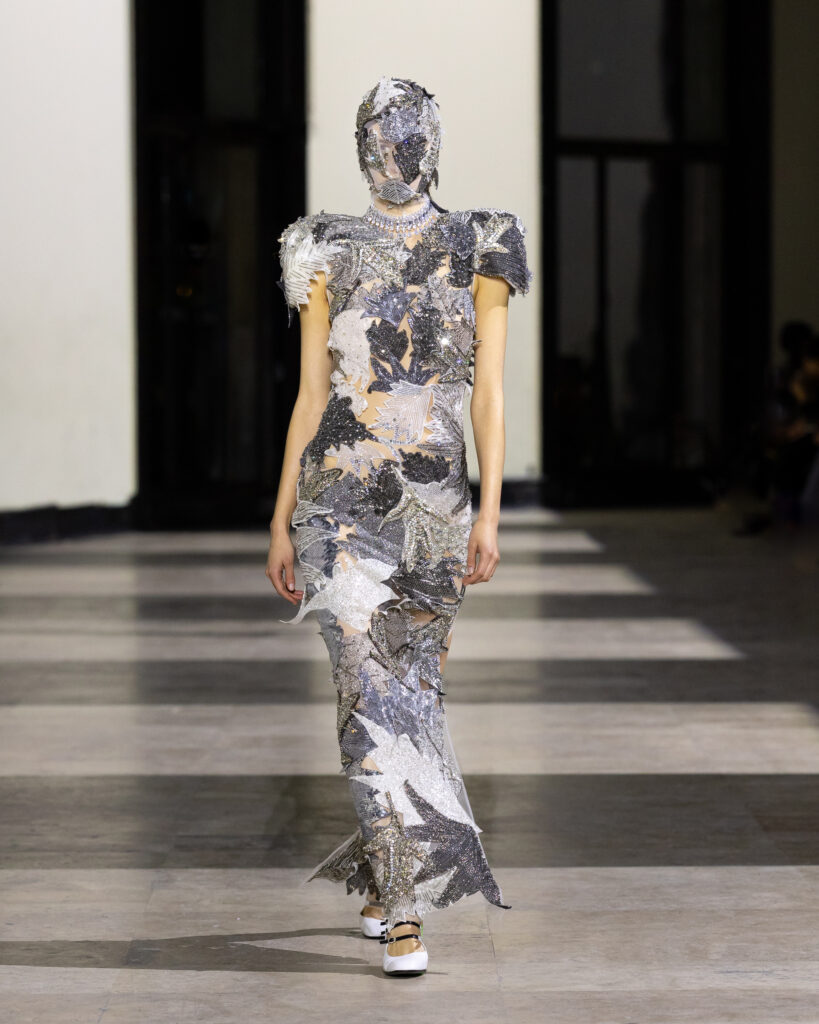 Certaines tenues ont été sublimées par broderies, incrustations et finitions délicates, tandis que d’autres ont été entièrement déconstruites et recomposées. Pour ce faire, les équipes de Germanier expliquent ainsi avoir démonté des structures originelles, réajusté des patronages, retravaillé des volumes, à l’aide de sequins recyclés, de bouteilles et de canettes brodées qui se sont alors retrouvées mariés à des matières nobles. Un travail titanesque qui, selon la Maison, a nécessité « des centaines d’heures » d’artisanat.