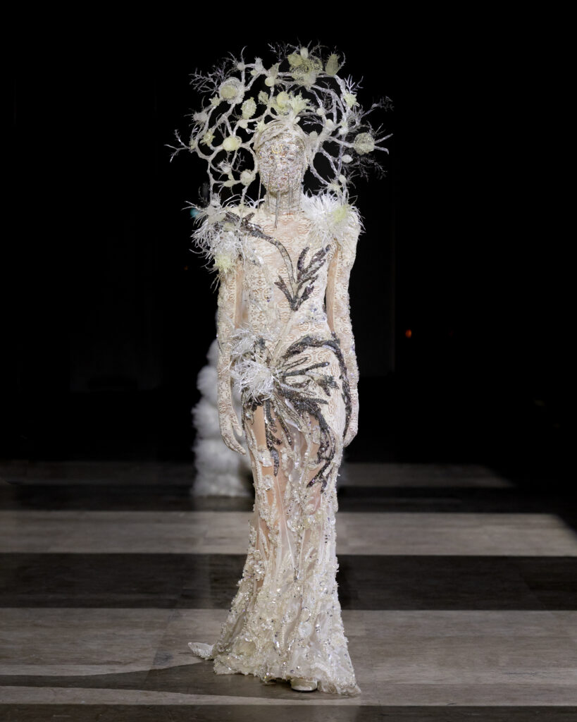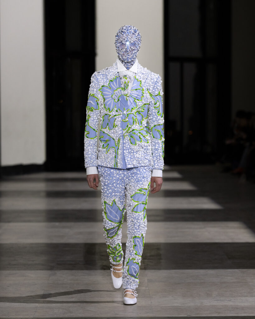 Des auras qui se retrouvent particulièrement dans les masques coiffant presque tous les looks – reflet à la fois des origines, mais aussi de l’aura discrète du créateur, dont la notoriété grandit sans qu’il n’expose jamais son intimité, sa vie personnelle.