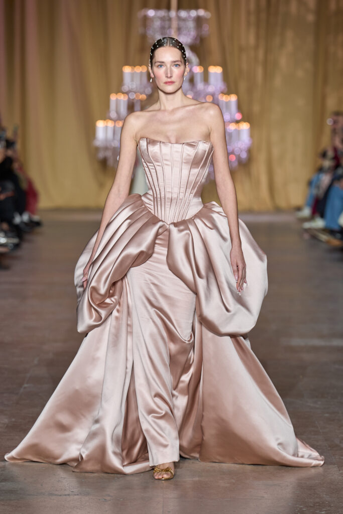 D’ailleurs, le titre de la collection, Chiaroscuro, dit tout. Hérité de la peinture de la Renaissance, le clair-obscur devient ici une métaphore textile : celle d’un monde traversé de contrastes, où la beauté naît précisément de la tension entre l’ombre et la lumière. Le designer de 54 ans reste alors fidèle à ce qu’il maîtrise le mieux : une couture architecturée, spectaculaire, avant tout pensée pour impressionner. Corsets coniques inspirés des années 1950, tailles ciselées, volumes marqués autour des hanches, jupes amples, drapés profonds, sur-jupes aériennes et décolletés sensuels dessinent des silhouettes fortes, assumées, parfois théâtrales. Rien n’est laissé au hasard, et certainement pas la mise en scène du corps.