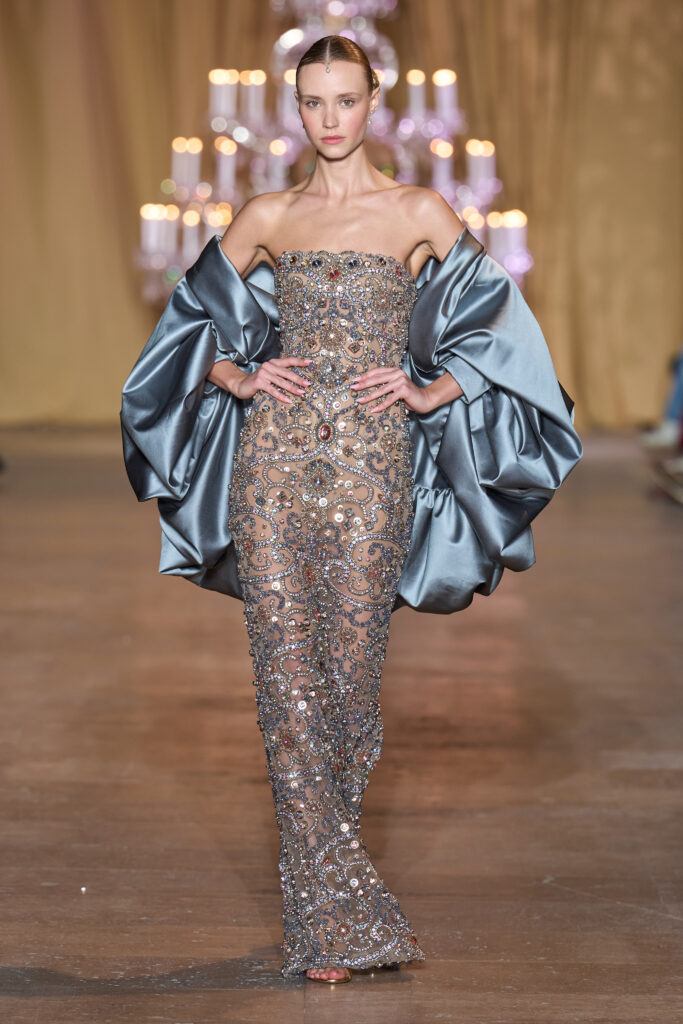 Mais cette maîtrise a aussi son revers. À force de convoquer les références de la Renaissance, du glamour classique et du grand soir, la collection peut parfois sembler davantage tournée vers le passé que vers l’avenir. Certaines silhouettes évoquent une vision du luxe très codifiée, presque nostalgique, qui dialogue peu avec les interrogations contemporaines de la couture. Ici, Zuhair Murad ne cherche pas à bousculer les lignes. Il ne déconstruit pas, ne provoque pas, ne joue pas avec les codes : il les consolide. Un parti pris qui peut séduire par sa constance, mais qui pose question à l’heure où la Haute couture explore de nouveaux récits, plus ancrés dans le présent.