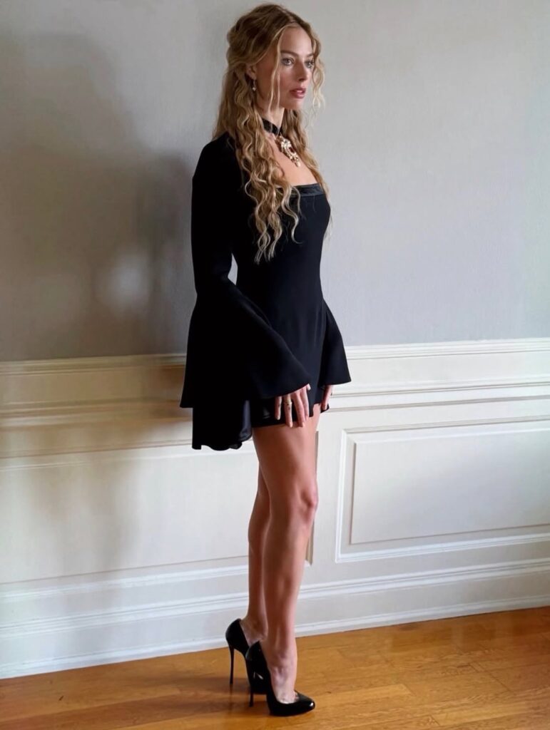 Mardi 27 janvier, Margot Robbie s’est photographiée dans une robe de la collection Croisière 2026 de Roberto Cavalli. Ce, assortie aux iconiques escarpins Christian Louboutin.