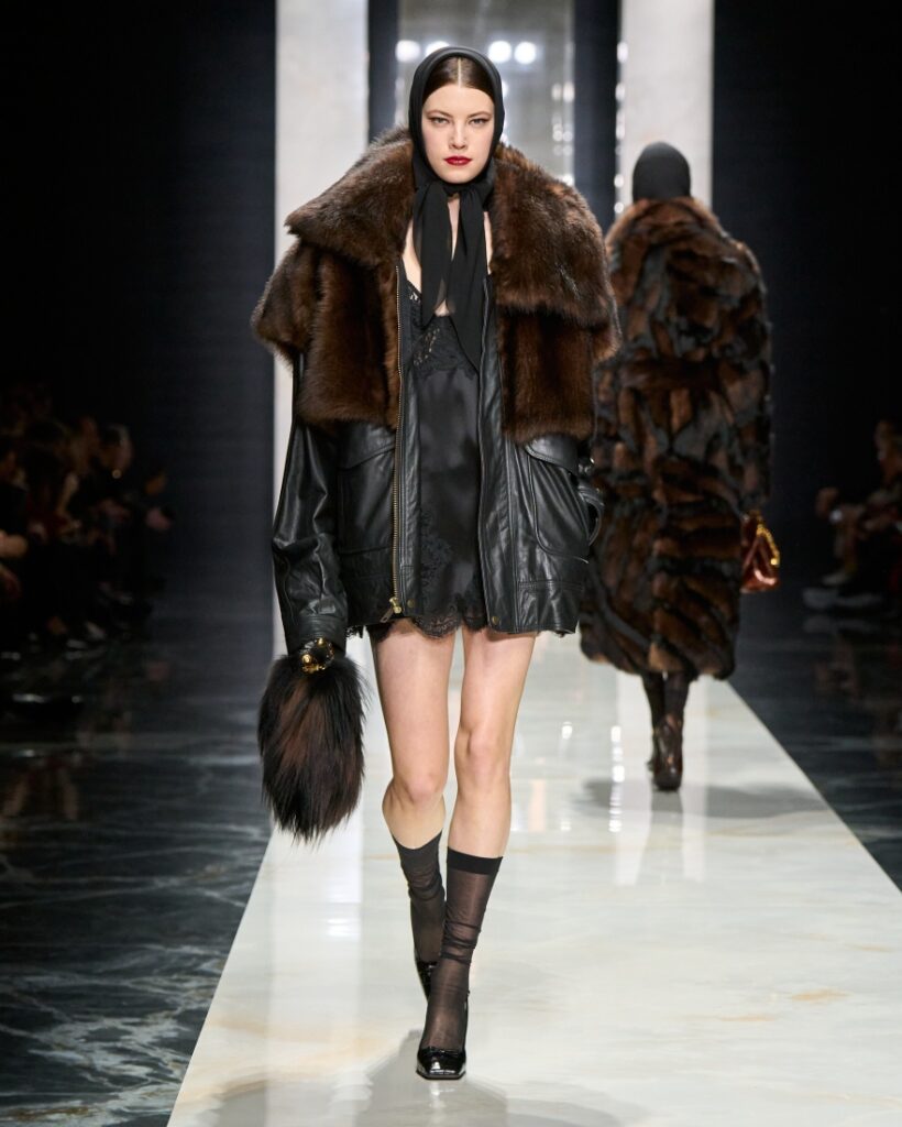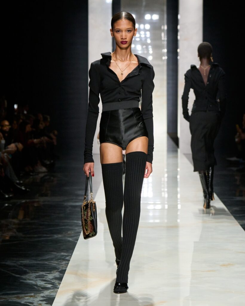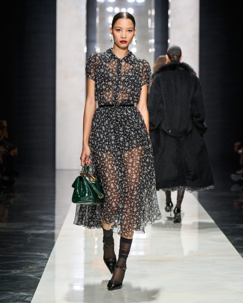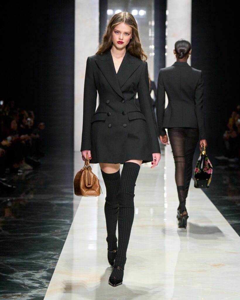 Domenico Dolce et Stefano Gabbana ont présenté samedi 28 février une collection signature pour l’automne-hiver 2026/2027. Les deux créateurs jouent avec les codes qui ont fait de leur maison l’une des marques les plus prestigieuses au monde. L’histoire se raconte en noir, omniprésent ; ce dernier est décliné avec audace dans des matières glamour et iconiques comme la dentelle, le velours et le satin. Le blanc, le gris et le bordeaux, quant à eux, ont valeur de ponctuation. Puis, les incontournables, tout droit sortis du vestiaire masculin, étaient présents : cravates, bérets siciliens et tailleurs pour femmes à revers en pointe, déclinés dans des lainages unis mais étudiés ou « gessati » – rayures craie. Les fausses fourrures, volontairement ostentatoires, étaient coordonnées à des robes en dentelle.