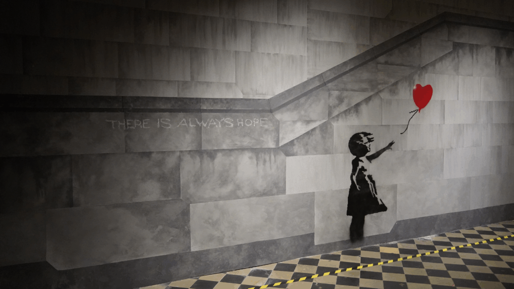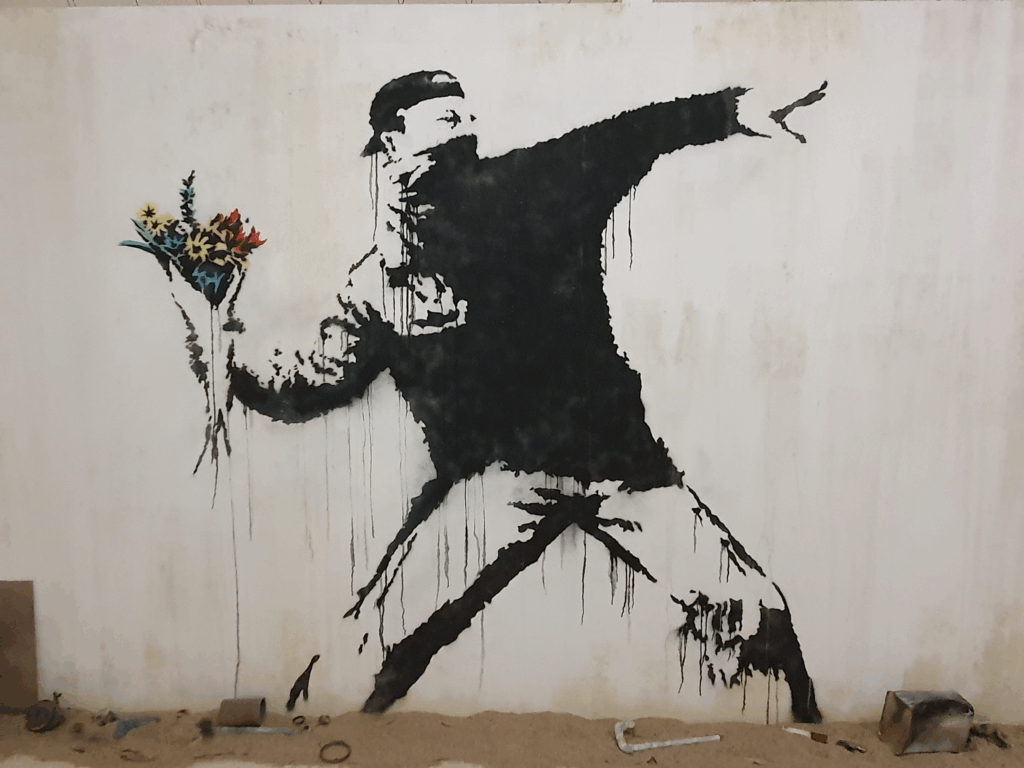 Présent sur la scène street‑art depuis les années 1980, Banksy a bâti sa légende mondiale en opérant dans l’ombre. Parmi ses œuvres les plus édifiantes, la petite fille au ballon au rouge ou l’homme qui lance un bouquet de fleurs durant la guerre en Palestine.