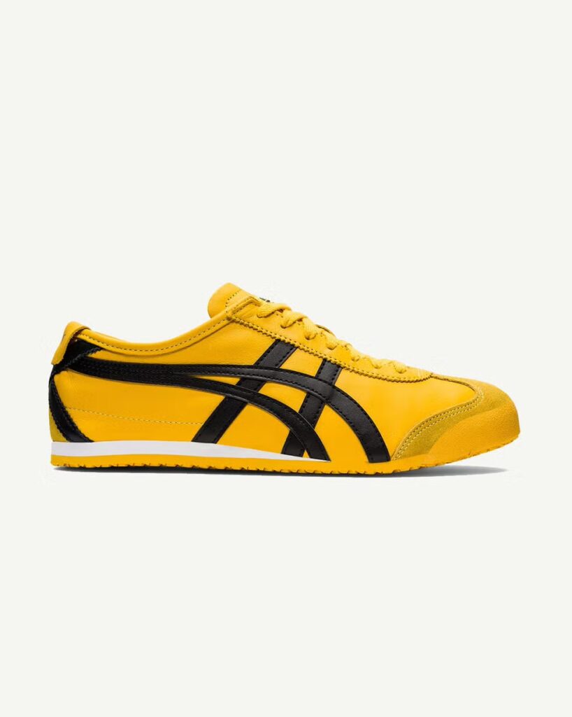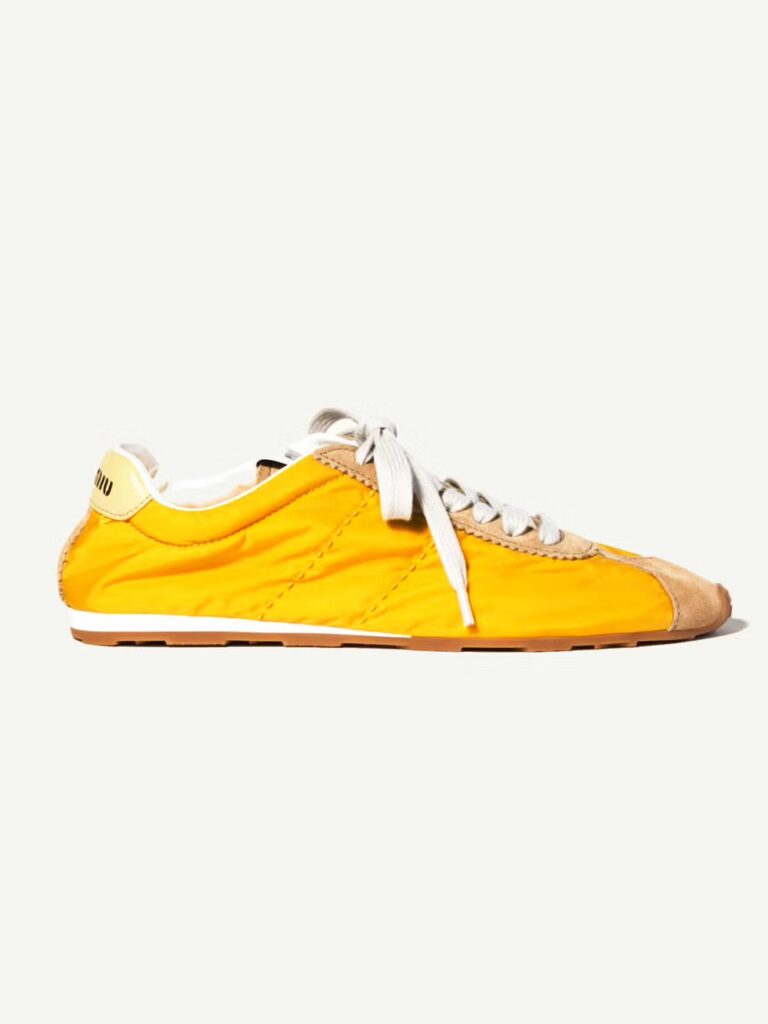 Qu’il s’agisse d’une petite robe noire ou d’un pantalon tailleur bleu marine, une tenue sombre peut être rehaussée par les tons vifs et joyeux d’une basket jaune.