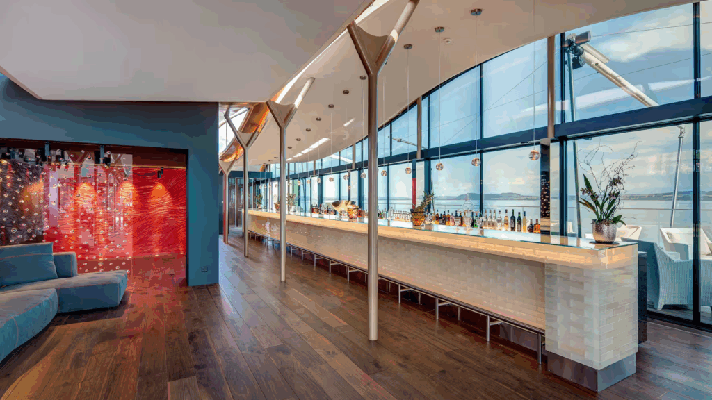 Baigné par la lumière de ses baies vitrées, le Waves Sky Lounge Bar illumine de futurisme entre ses lignes courbées et son bar tout de blanc. Perché au 7e étage, il survole la ville et offre une vue panoramique sur le lac.