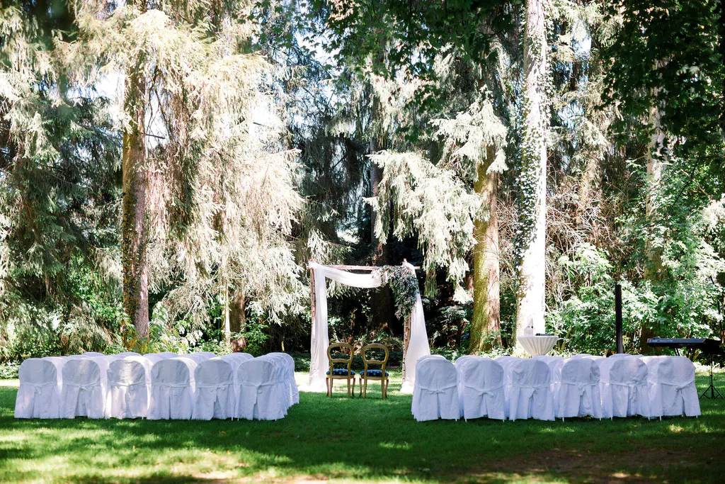 On arrive au Schloss Hünigen comme on entre dans un jardin secret : un parc foisonnant où plus de 3500 rosiers dessinent un décor presque théâtral autour d’un château vieux de quatre siècles. Ici, le mariage commence souvent dehors, sous les arches fleuries ou au détour d’une allée parfumée. À l’intérieur, deux univers se répondent : la May Saal, avec son caractère historique, et la Hallersaal, résolument moderne, ouverte sur le parc grâce à ses grandes baies vitrées. Les couples y orchestrent leur journée comme ils l’entendent : cérémonie dans le jardin, réception sous les arbres, banquet dans la salle qui leur ressemble.