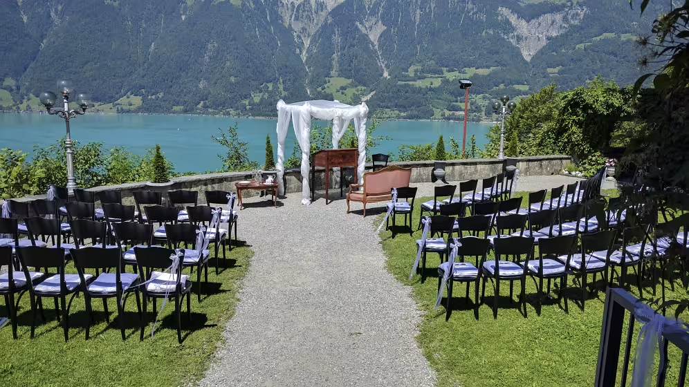 Au Grandhotel Giessbach, le décor n’a rien d’ordinaire : ici, le mariage se vit au rythme des célèbres chutes qui dévalent en 14 paliers juste à côté du bâtiment. Ce palace de la Belle Époque, édité en 1872, est perché au‑dessus du lac de Brienz et accessible par le plus ancien funiculaire d’Europe. Il offre un paysage intact, où la cascade gronde comme une bande‑son naturelle et où les montagnes encadrent chaque instant. Puis viennent les festivités sur les terrasses ou dans les salons historiques, baignés de charme rétro. Entre arrivée théâtrale, nature spectaculaire et atmosphère hors du temps, Giessbach offre un mariage qui ne ressemble à aucun autre.