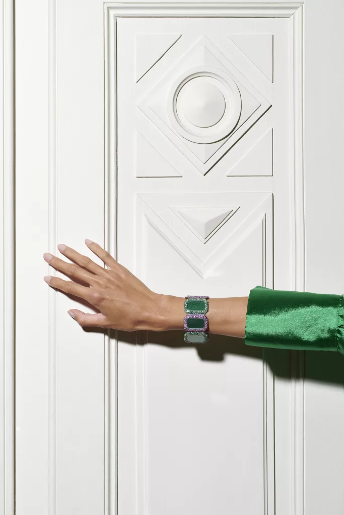 On a trouvé l’accessoire idéal pour apporter un côté star et très hollywoodien aux poignets de toutes les femmes élégantes: le bracelet manchette de la Maison Belmont. En or rose 18 carats et argent noirci, il se compose de sept éléments de forme octogonale tapissés d’une délicate soie couleur émeraude. Ce bijou