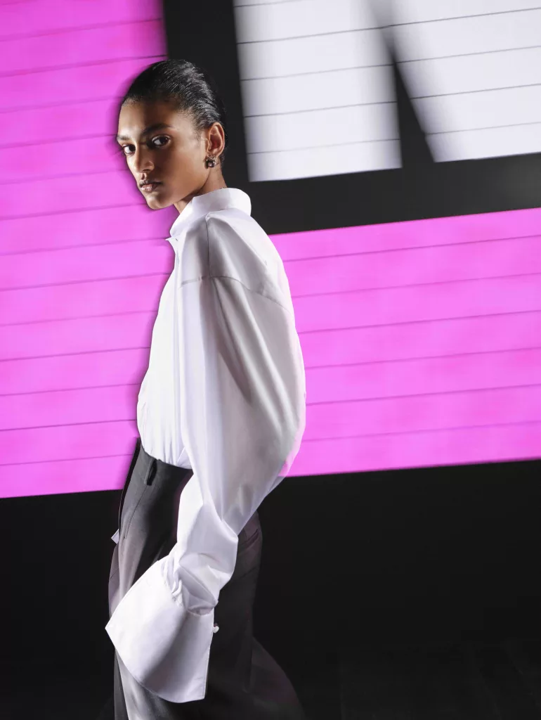 Double croisé, revers en pointe satiné sur cette veste look smoking réactualisée avec des effets graphiques «nero/bianco». Cette dernière épouse les seins et les hanches et pourtant elle rappelle aussi à l’univers rigoureux du vestiaire masculin. Cette interprétation subtile flirte avec le yin et yang, et en fait une pièce couture remarquablement bien pensée.