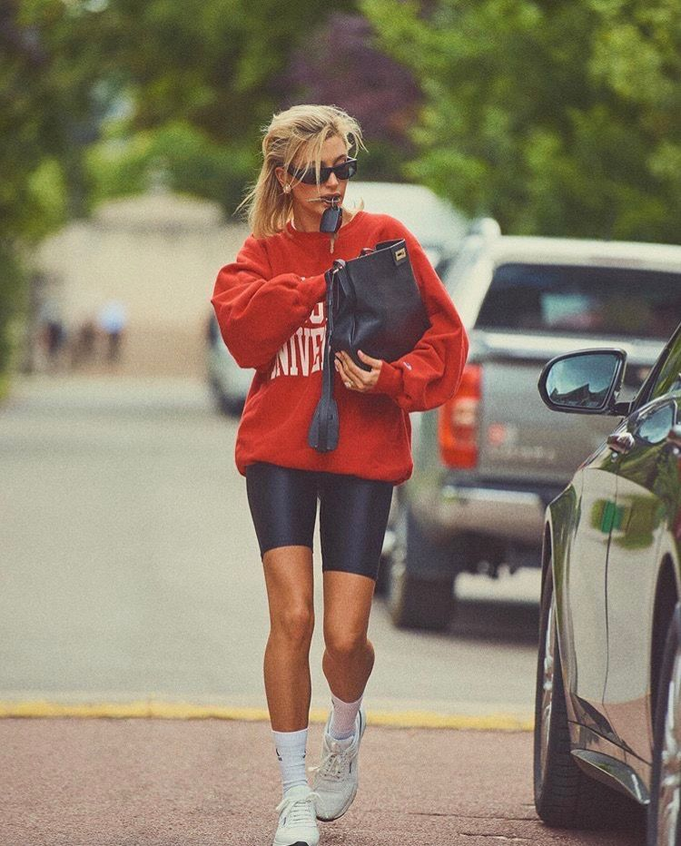 Associer un sweat-shirt à un short de cycliste est un choix tendance intemporel. Cette saison, opter pour un sweat-shirt oversize est un choix parfait pour un look décontracté au quotidien. Suivez l’exemple du mannequin Hailey Bieber en ajoutant des lunettes de soleil, des baskets blanches, puis complétez le tout avec un sac au style classique pour obtenir un ensemble décontracté et branché.